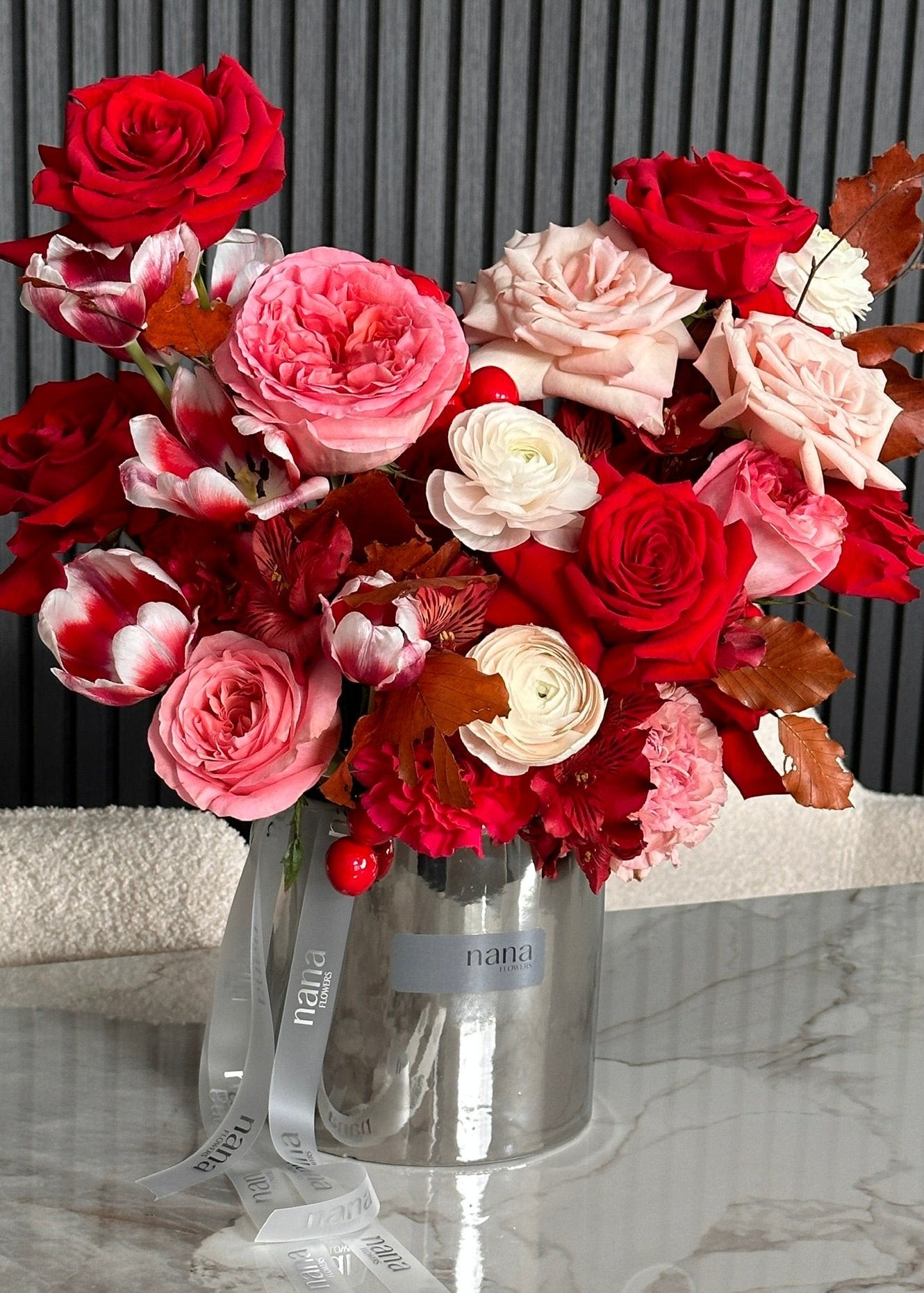 This fresh bouquet is filled with: Roses, Garden Roses, Carnation, Ranunculus, Tulips.